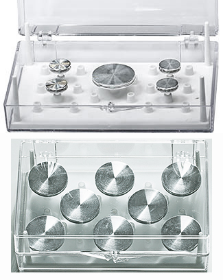 The EM-Tec pin stub storage boxes and storage tubes are designed for storing samples on either the standard pin stub or the shorter Zeiss pin stubs. They can be used for sample handling, long term storage, archiving and even for storing pin based sample holders. The larger wooden and large clear plastic box all comprise a custom high density closed cell foam sheet with holes for the pin stubs. The high density closed cell foam material doesn't crumble and is elastic enough to allow removing and replacing pin stubs at the same position. The large capacity storage boxes are more economical and present a 40-50% cost reduction when storing large numbers of pin stubs. There is a choice of small, medium and large capacity EM-Tec pin stub storage boxes and several single pin stub storage or shipping tubes: